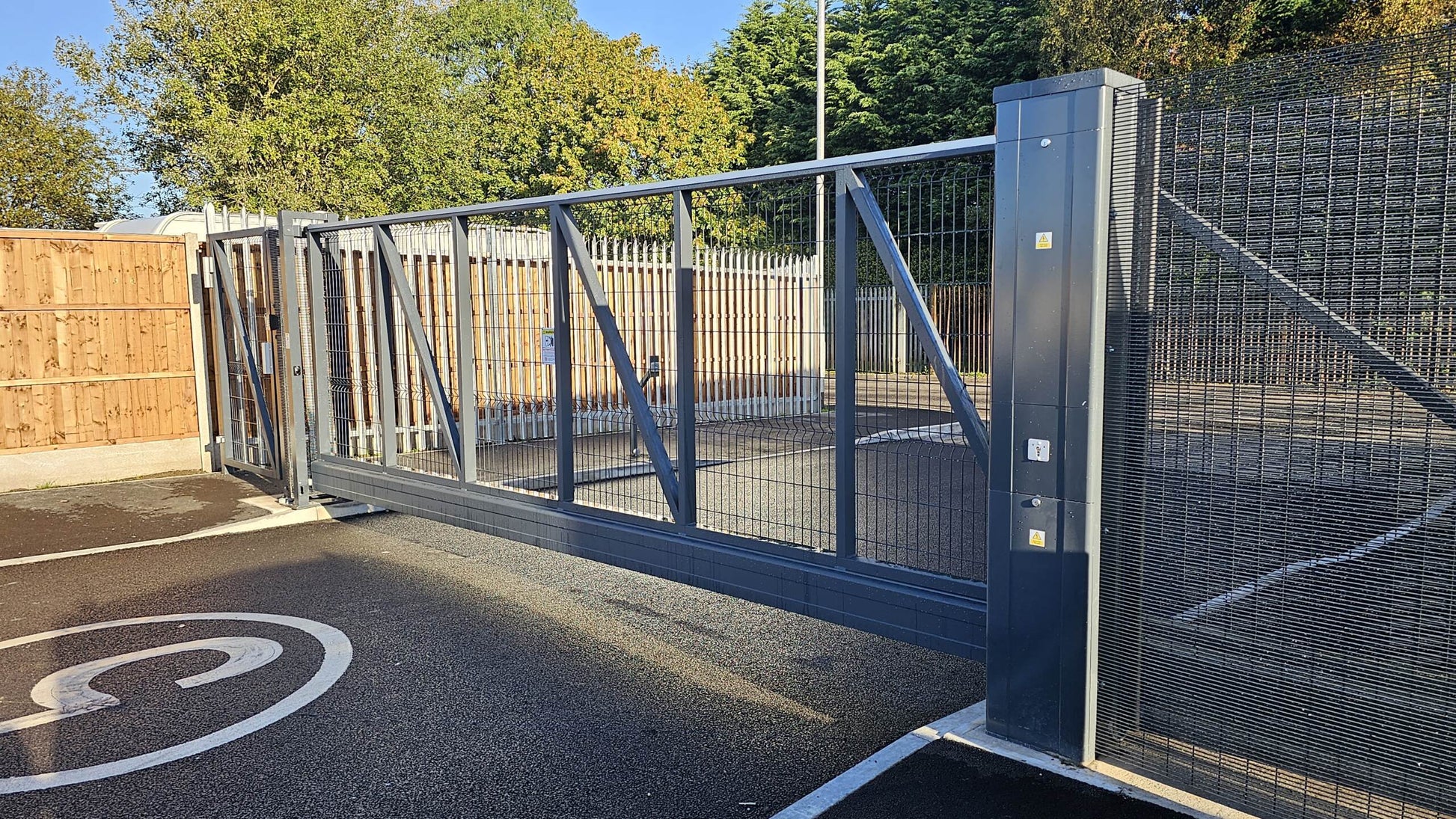 Our cantilever gate systems glide smoothly without ground tracks, making them ideal for uneven terrain, gravel driveways, and high-traffic commercial entrances. Featuring dark anthracite steel frames with welded mesh or vertical bar infill panels, these gates deliver reliable automated operation across openings up to 60+ feet.